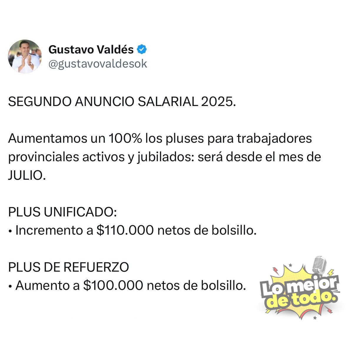 “Aumentamos un 100% los pluses para trabajadores provinciales activos y jubilados”, publicó Valdés, detallando que el Plus Unificado pasará a $110.000 netos y el Plus de Refuerzo alcanzará los $100.000, también netos.