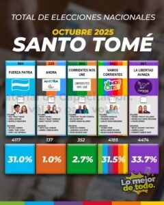 SANTO TOME. El armado político del presidente Javier Milei que se terminó imponiendo en todo el país en las elecciones legislativas de medio término de este domingo 26, también se vio cristalizado en Santo Tomé donde alcanzó un claro triunfo sobre sus oponentes que en este caso eran de “Vamos Corrientes” que representa al oficialismo provincial y a Fuerza Patria que aglutinó al peronismo y sus aliados. Votó un porcentaje mayor al sesenta y cinco por ciento del electorado.
