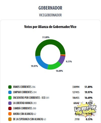 En los 25 departamentos de la Provincia, el oficialismo local representado por la alianza Vamos Corrientes, logró la victoria. Los datos se desprenden de los datos finales de los comicios: